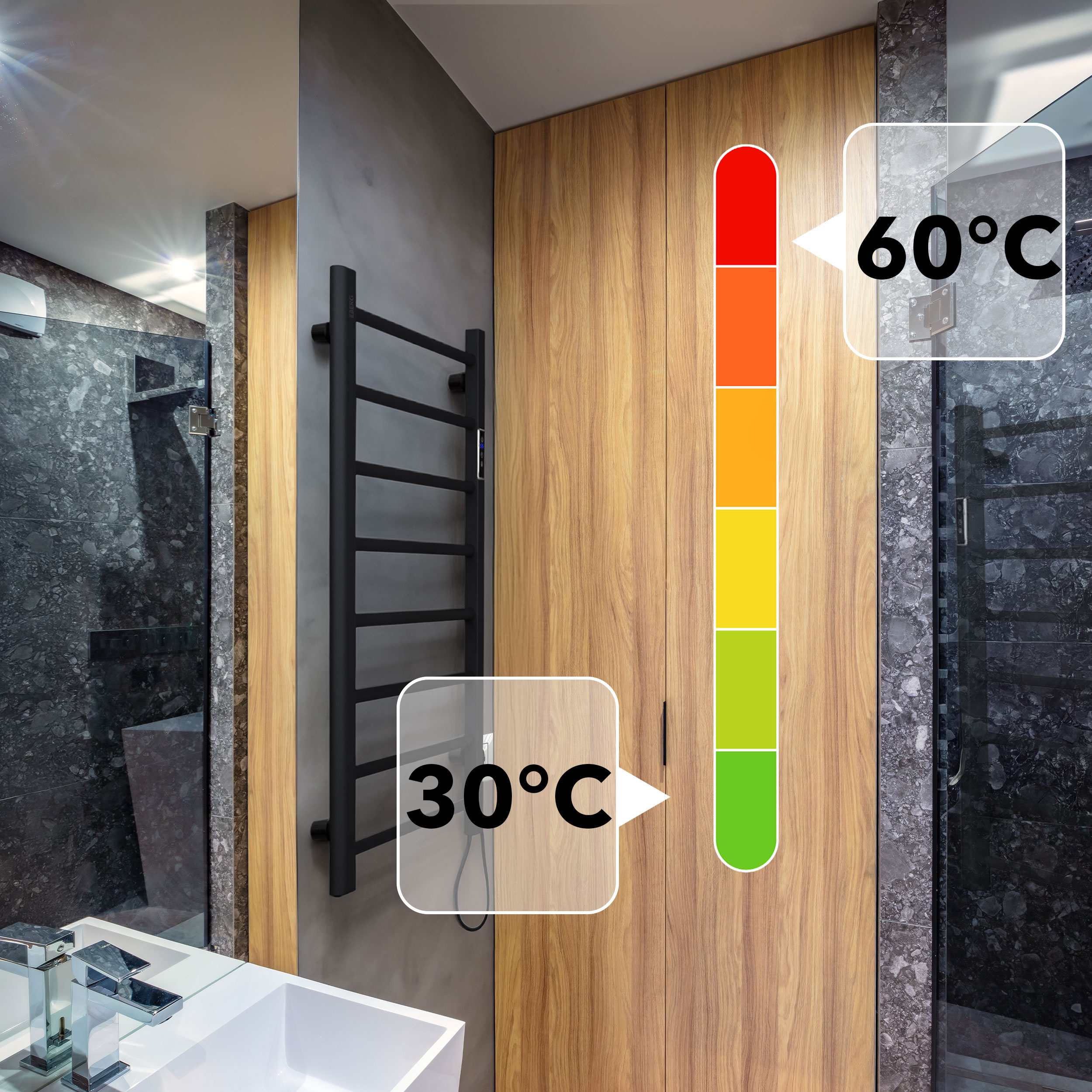 Grzejnik pozwala na wygodną regulację temperatury w zakresie od 30°C do 60°C.