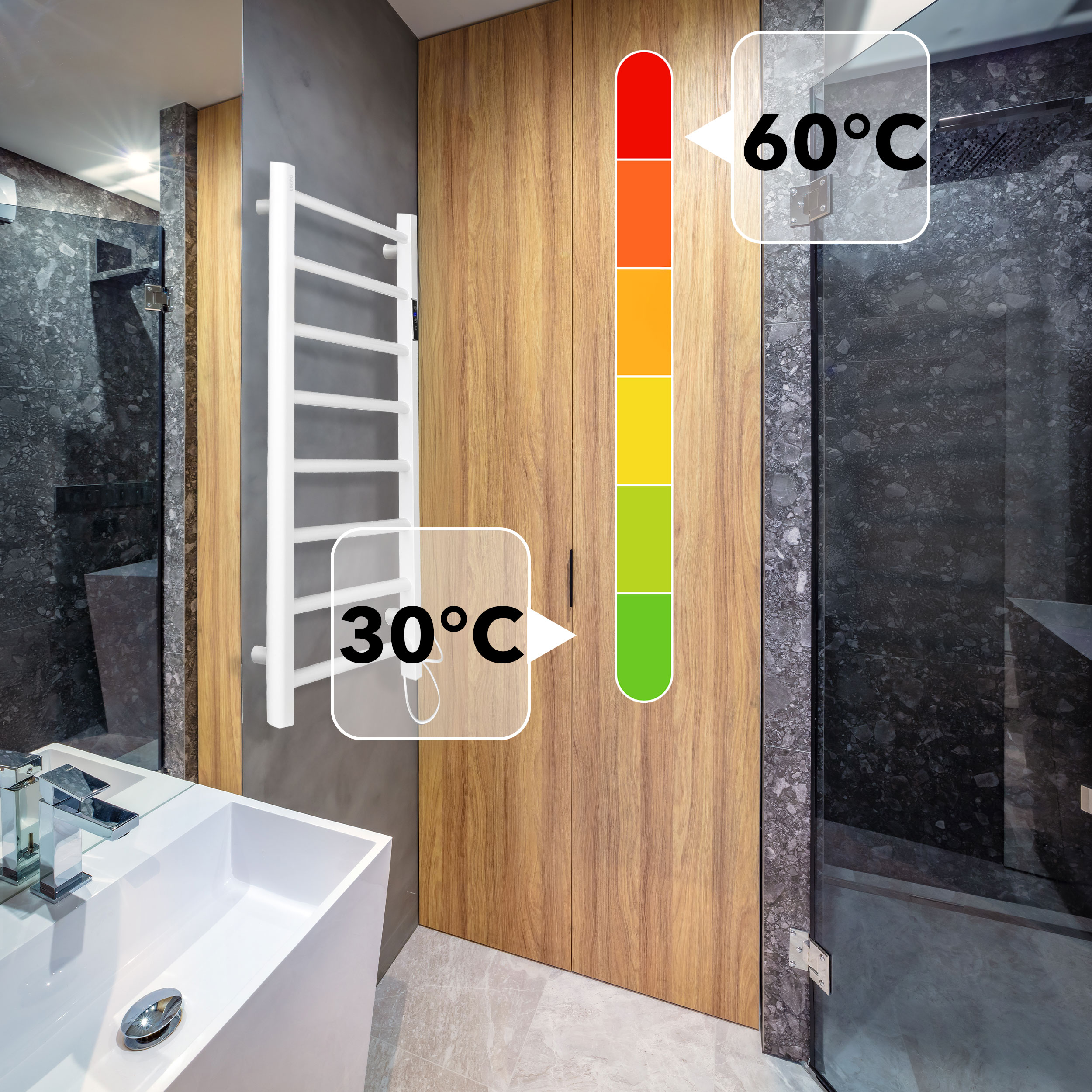 Grzejnik pozwala na wygodną regulację temperatury w zakresie od 30°C do 60°C.