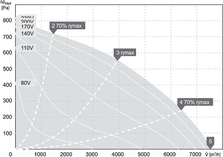 Dachowy wentylator promieniowy wyposażony w silnik zlokalizowany poza strumieniem przepływającego powietrza. Konstrukcja wentylatora składa się z obudowy w kształcie ośmiokąta, dzięki której redukowana jest strata ciśnienia przepływającego strumienia powietrza, oraz kwadratowej płyty montażowej wykonanej z galwanizowanej blachy stalowej. Obudowa wykonana jest z aluminium odpornego na działanie wody morskiej (AlMg3).